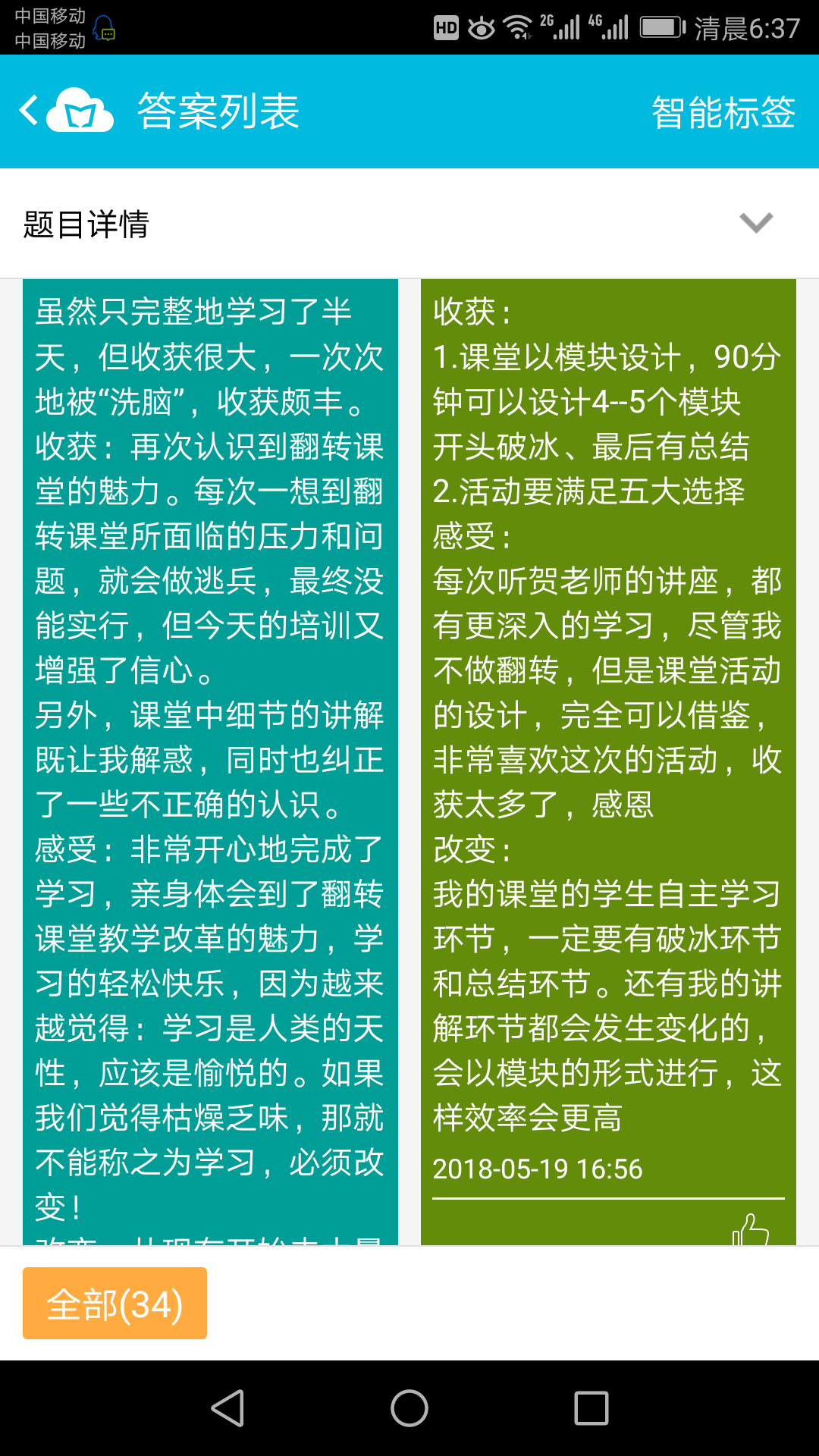 在实施的过程中,老师们表现出了非常高昂的学习兴趣,随着贺老师的引导,深度体验式地参与到学习中去,在课堂讨论环节、最后的展示和交流中,场面达到火爆的程度,这样的氛围也让老师们由衷地感叹,“原来教学和学习可以是这样的!”,“学到了好多做好教学工作的实用方法”,“做好翻转课堂的信心更足了!”