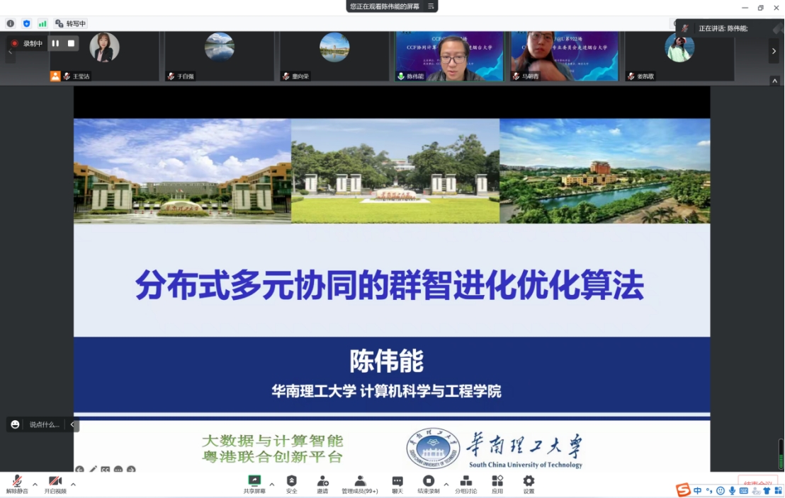 陈伟能作了题为“分布式多元协同的群智进化优化方法”的报告。他介绍了基于自然界群智行为所推演出的粒子群优化算法以及蚁群、蜂群等算法在群智感知上的应用。他指出,随着物联网、边云计算等技术的快速发展,群智进化计算内在的并行分布式特性与分布式计算平台相互契合。陈伟能详细介绍了分布式平台下多元协同的新一代群智进化优化方法,讲解了分布式多元协同群智进化计算的整体框架,从维度、数据和目标协同的三个不同角度阐述了分布式群智进化计算的多元协同机制,并介绍其应用在解决超大规模、分布式大数据驱动的复杂决策与优化难题的途径。