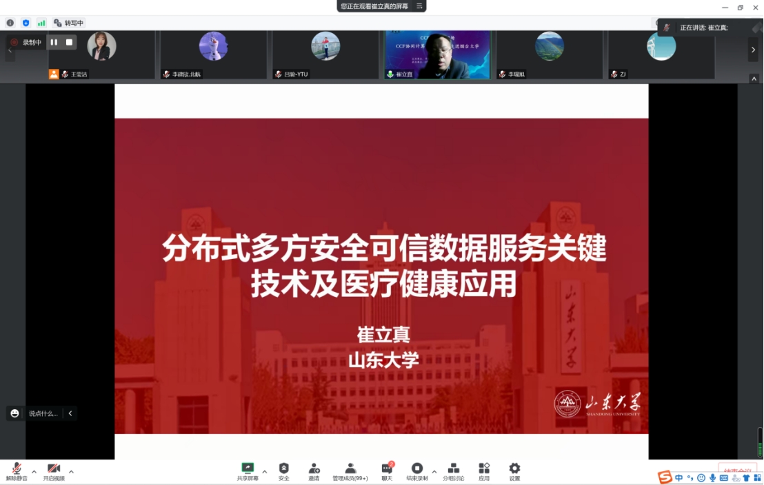 崔立真作了题为“分布式多方安全可信数据服务关键技术及医疗健康应用”的报告。报告主要围绕数据安全服务展开,指出数据要素是数字经济深化发展的关键生产要素和核心引擎,为保证其在交易流动中释放出更大的价值,安全可信的数据服务成为不可或缺的关键部分。崔立真重点围绕支持自主分布式安全数据库服务的关键技术及其在医疗健康卫生大数据的隐私保护与安全共享的应用展开,重点介绍了分布式多方数据资产管理如何在可信安全和支持隐私保护的环境下更好地实现大规模数据的共享与利用。