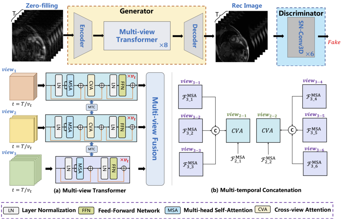 该论文提出了一种关注心脏重建的基于区域聚焦多视图Transformer的生成对抗网络。多视图Transformer将连续的心脏帧分成多个视图进行跨视图特征提取,在特征之间建立长距离的依赖关系,从而有效地学习时空信息。该论文进一步设计了一个用于时空信息融合的跨视图注意力机制,确保每个视图中不同时空信息的相互作用,并捕捉到更多的心脏运动的时间相关性。此外,论文还引入了一个心脏区域检测损失,以提高心脏区域的重建质量。