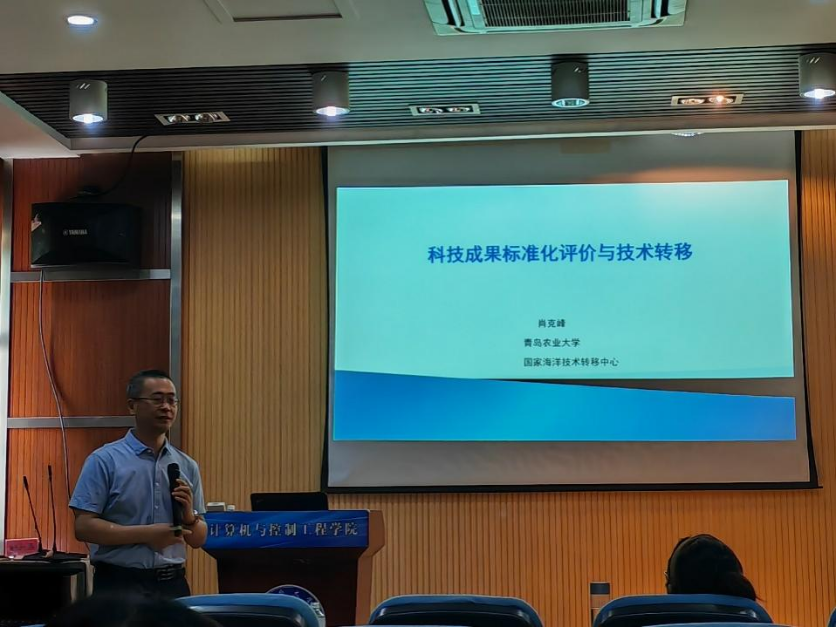 9月5日下午,国家海洋技术转移中心特聘专家、青岛农业大学肖克峰副教授应邀为久久小说 师生作了题为“科技成果标准化评价与技术转移”的学术报告,科技处张立雨、姜滔老师,久久小说 科研骨干和研究生参加报告会,副院长王莹洁主持。