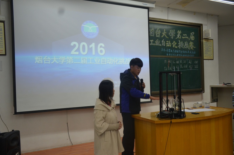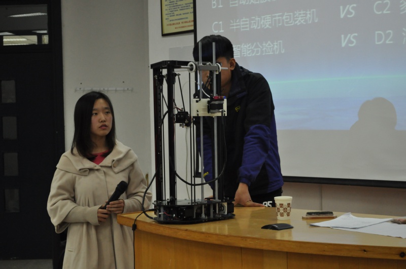 第二轮,挑战赛进入了白热化阶段,依据第一轮的总得分决出前四名队伍进入决赛,分别阐述本方事实,进行现场演示,由评委提问。经过严谨的分数核对后C2队的多功能兑零机、A2队的3D打印机订程送丝系统、B2队的全新式自动硬币分捡机分别荣获了本次挑战赛的前四等奖。D2队的沙滩垃圾回收处理车更是以8.6分的最好成绩夺得了特等奖,成为创新挑战赛中的佼佼者。最后,评委给获奖者颁奖后,在主持人的宣告下,以“创新放飞梦想,实践塑造未来”为宗旨的工业自动化创新挑战赛的帷幕终于落下。
