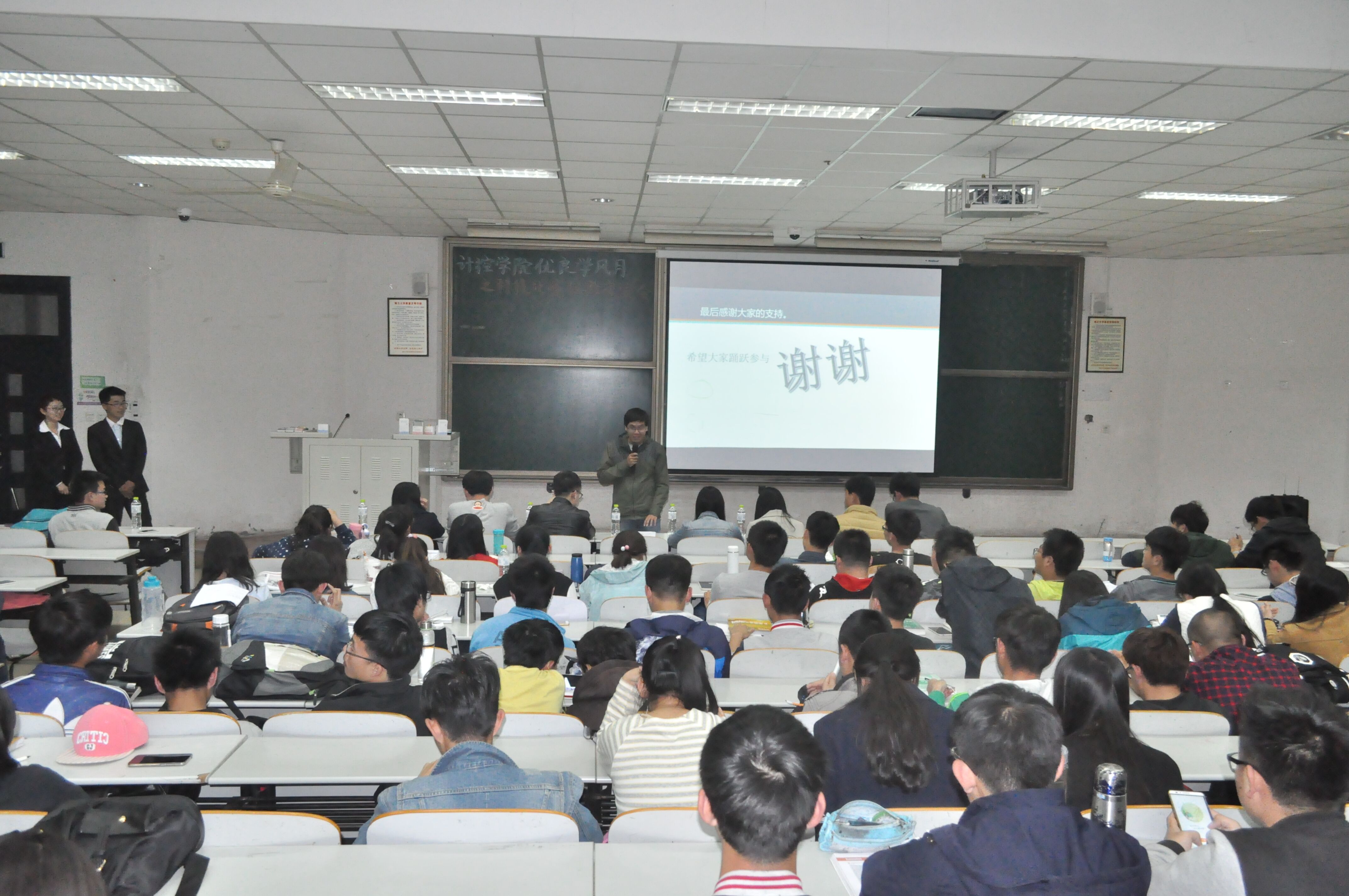 本次经验交流会邀请到了在2015年各类科技竞赛中获奖的队伍和个人,吸引了众多同学前来参加,会场座无虚席。在同学们的热切期待中,会议于七点正式开始。首先,由自动化协会的李文通向同学们讲解了他参加全国大学生“西门子杯”工业自动化挑战赛的心得体会;紧接着,张宇介绍了有关ACM程序设计大赛的流程以及规则,重点介绍了他们团队合作的事迹,强调了团队合作的重要性;随后,刘营聪分享了飞思卡尔杯全国大学生智能车竞赛的过程与收获,并向同学们介绍了智能车、单片机等方面的内容;刘庆峰向大家介绍了全国大学生数学建模大赛的相关流程和需要学习的内容;最后,周童晖介绍了蓝桥杯全国软件专业人才设计与创业大赛的基本情况以及他的比赛经历和宝贵经验。至此,大会在同学们的热烈掌声中圆满结束。
