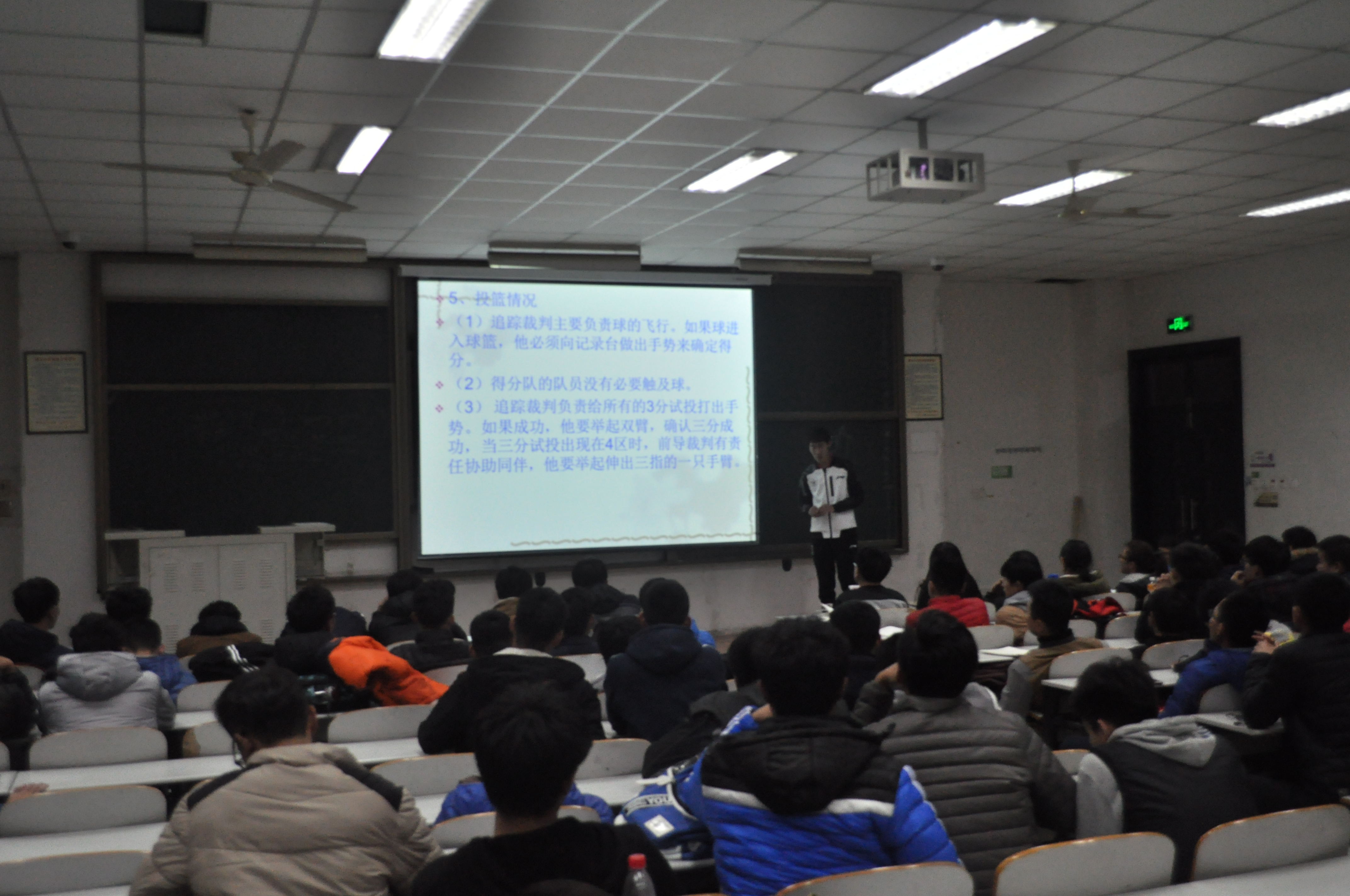 裁判协会会长龙鑫上台演讲。首先,他对现在的篮球赛进行分析,并介绍了自己以往参加吹罚比赛的经验与心得。伴随着精心准备的PPT文件,他介绍并且演示了裁判手势的动作,向同学们剖析每个动作的要领和神态。随后,他讲解了比赛时间、加时赛、暂停和替换时机时裁判应该做的占位与手势,以及如何向技术台传达信息等。而后,他又展示了当遇到球员受伤以及犯规后裁判应有的反应与职业素养,他表示,每位裁判都应该具有裁判气质,公正公开是原则,正式大方是基础。在台下的几位参加此次培训会的裁判纷纷表示赞许与赞同。培训会最后,体育部部长王加宝表示,一场比赛,如果不懂得规则,无论实力多强,获胜的可能也为零,因此,比赛的规则尤为重要。至此,会议圆满结束。